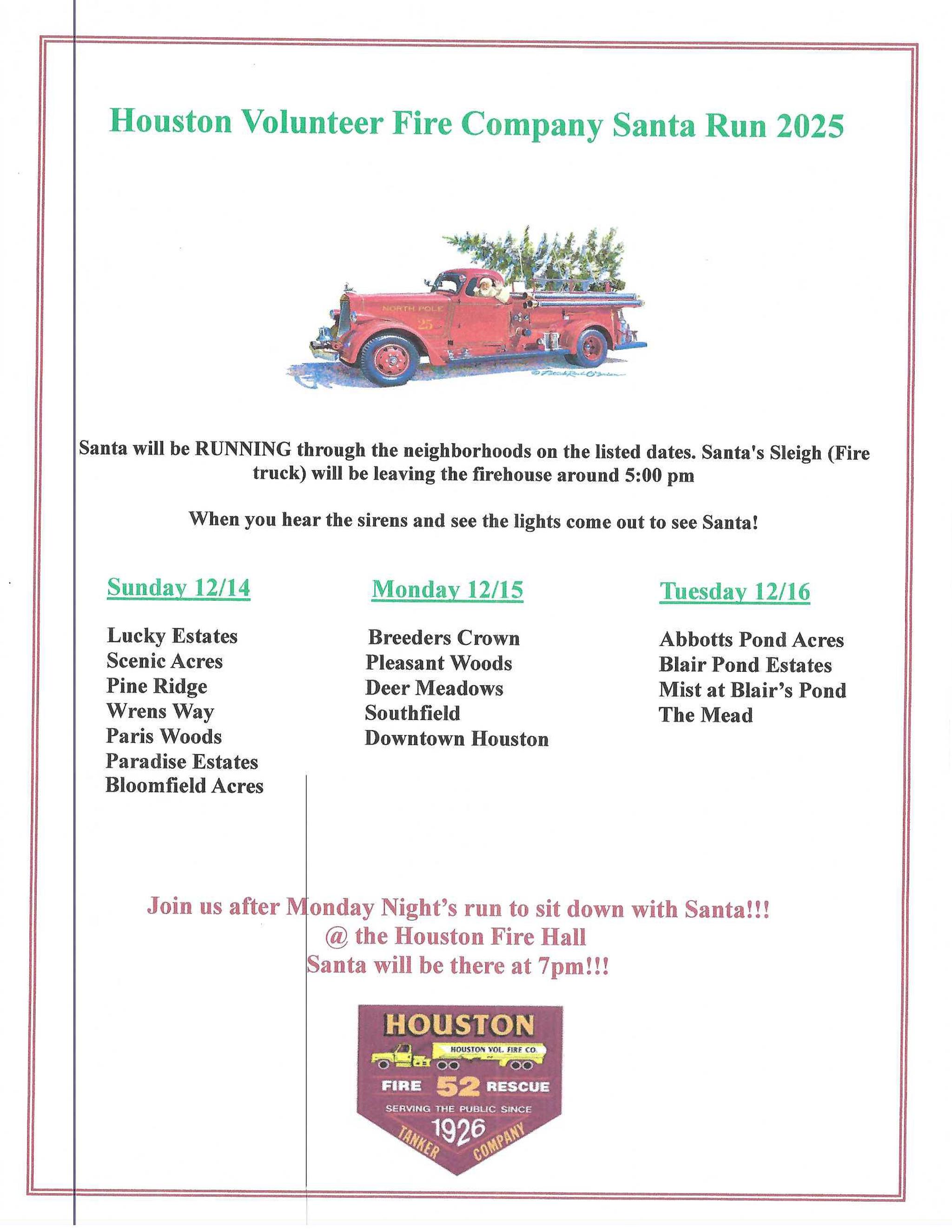 Please Join us when you hear the sirens coming down the street as we help Santa make his way back to the North Pole! Areas Santa will be visiting is listed on the flyer and don't forget to stop by the Fire House on Monday December 15th. We were told by Santa himself he is stopping by for a visit!